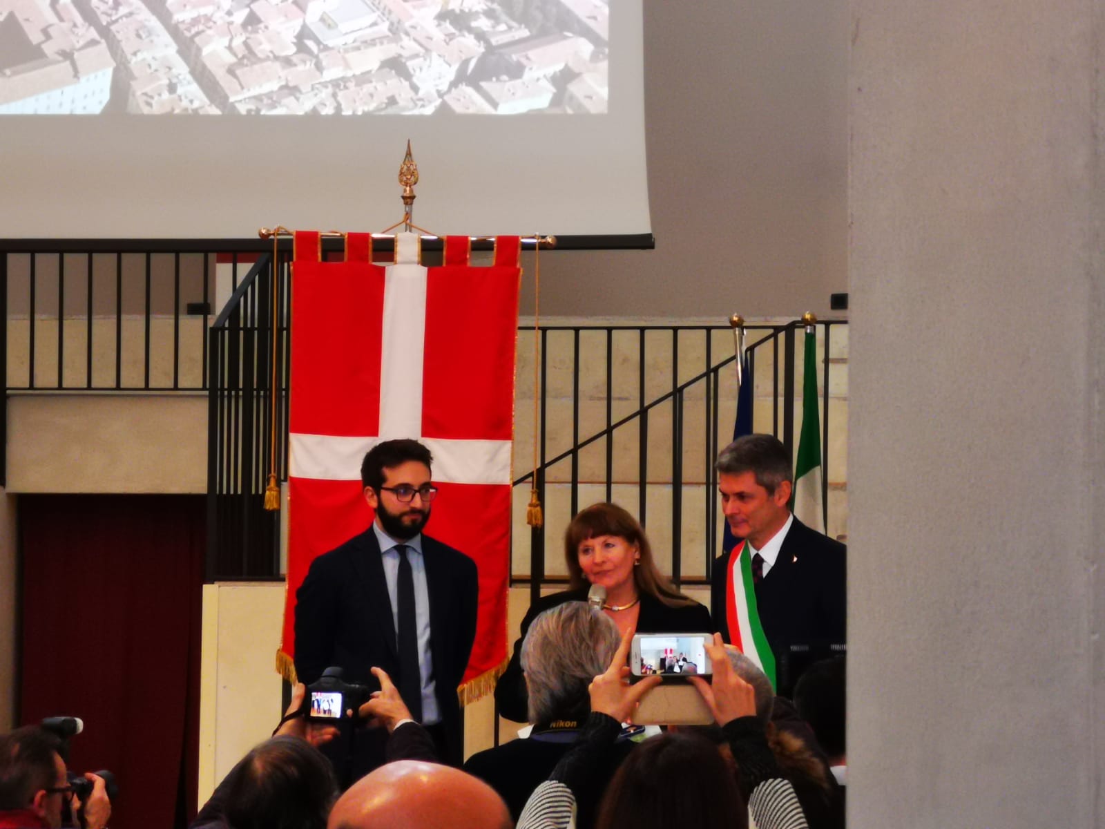 Der Präsident des Gemeinderats von Pavia Nicola Niutta – Angela Battaglia Richichi – Der Bürgermeister von Pavia Mario Fabrizio Fracassi